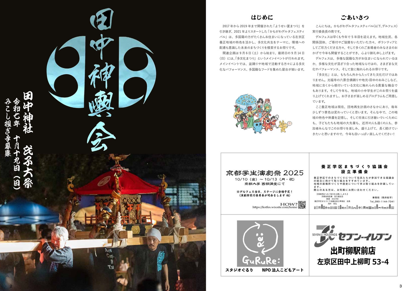 左京区・出町柳周辺の養正地域にて、多文化共生をテーマに、環境への配慮も意識した未来のまちづくりを目指し、毎年秋に地域のお祭り「かもがわデルタフェスティバル」を開催しております。昨年は、1000人を超える多くの方々にご来場いただき、盆踊りをはじめとした催しで大いに賑わいました。本年も9月に開催を予定しており、現在鋭意準備を進めております。
